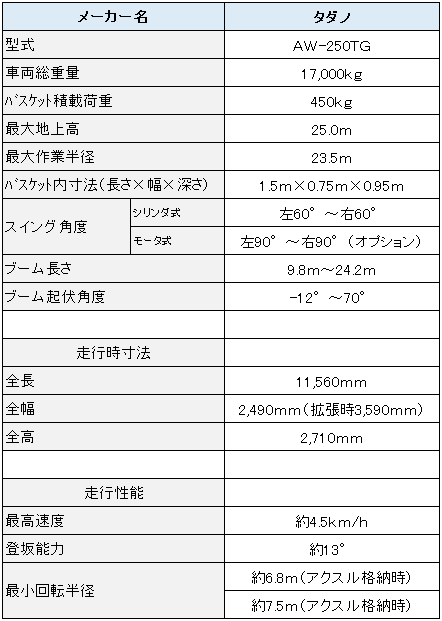 | 型式 | 作業床最大高さ | 作業床最大積載量 |